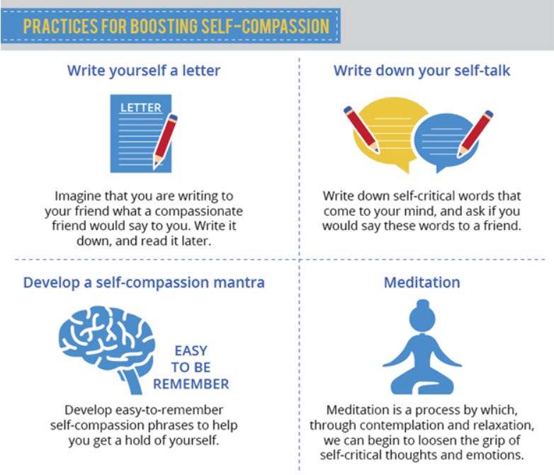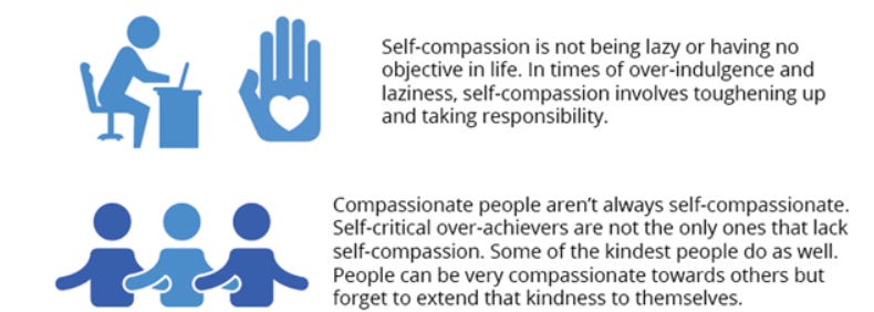One of our favorite graphics of all time is from Stanford’s CCARE (Center for Compassion and Altruism Research & Education, click here for the full graphic). It goes over different benefits and tips for self-compassion, but here is a section I (Shriya) have had bookmarked since I started studying self-compassion 6 years ago: